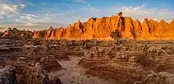 Badlands National Park is a national park in southwestern South Dakota. This park is marked by rugged "badlands" terrain, sharply contrasting with the rolling hills and prairie surrounding it. The rock and soil formations resemble a science fiction landscape of another world - domes, twisted canyons and slanted walls striped in different colors.