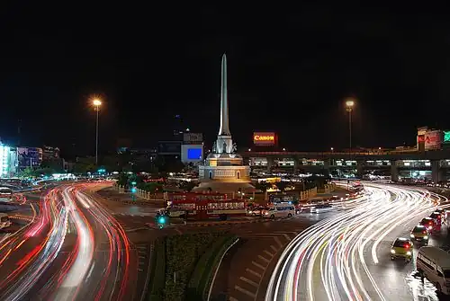 - 🌍 Victory Monument (อนุสาวรีย์ชัยสมรภูมิ) (BTS Victory Monument). This monument was constructed in 1941 by military dictator Plaek Pibulsongkhram to commemorate the 59 Thais who lost their lives in the short and inconclusive Franco-Thai War. It resulted in Thailand annexing some territories in western Cambodia and northern and southern Laos. However, Pibulsongkhram was kicked out in 1944 and the patch of land gained by Thailand was handed back to Laos and Cambodia in 1945, making the "victory" a little hollow. These days this spiky Bangkok landmark is better known as Bangkok's largest local bus hub. If travelling north by Skytrain, you'll be treated to a 180-degree curving panorama of the monument, and this is the best view you can get as actually reaching the base of the monument would require passing through a triple-laned traffic circle maelstrom of buses. The public toilets at the major bus stop directly across from the monument costs 2 baht per entry. Free.