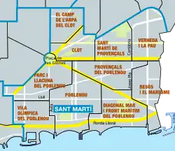 The Sant Martí district is administratively divided into 10 boroughs, each with a slightly different character. Areas of interest to the tourists are generally south of the Diagonal. The barris south of Diagonal are (from West to East):