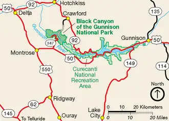 Black Canyon of the Gunnison National Park is a national park run by the National Park Service in Southwestern Colorado, 15 mi (24 km) east of Montrose. It contains 12 miles of a spectacular and scenic gorge called the Black Canyon. It is adjacent to Curecanti National Recreation Area.