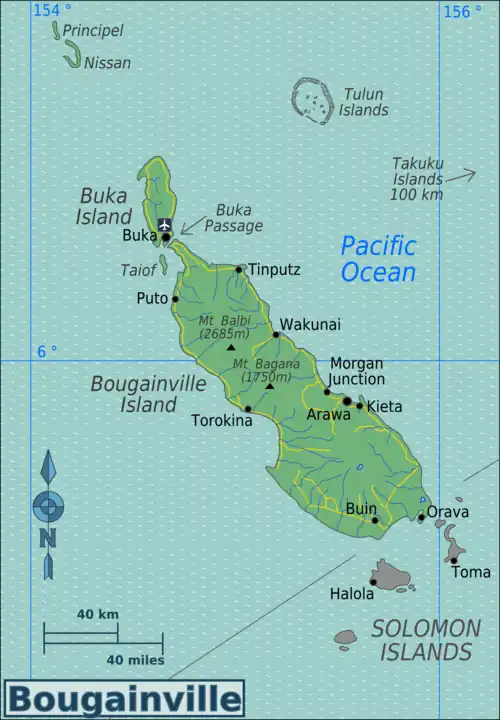 - Buka — during the civil war, Buka town replaced Arawa as the centre of government and most businesses also switched their operations here. This is very evident today as it is certainly the most bustling town in Bougainville. The airport and the majority of places to stay are all here. Buka is located on the island of the same name, just to the north of main Bougainville. The narrow strait between Buka Island and Bougainville is called the Buka Passage and is a key visitor attraction.