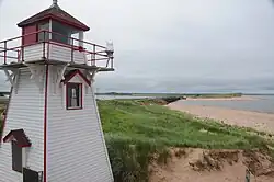 - π Covehead Harbour Lighthouse, Gulf Shore Parkway (inside Prince Edward Island National Park). The Covehead Harbour Lighthouse is square, tapered, 8.2-metre (26.9-ft) tall wooden tower surmounted by a square, wooden lantern. It is located among the sand dunes of Prince Edward Island National Park of Canada, on the beach just to the east of the entrance into Covehead Bay.