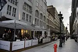 Vörösmarty tér). This is one of the main pedestrian thoroughfares and perhaps the most famous street of central Budapest. It was the first shopping street in Budapest. Back in 1690 it was called Lipot Street and it stratched into the Vaci Gate, the North exit of the city. It features restaurants and shops catering primarily to the tourist market. No. 4 Ferenc Bene House: built in 1840 was designed by József Hild is a three-storey neoclassical house with seven windows. No. 9 Seven elector-house, former Nako House, built (this edition) in 1840, former a hotel was here (German) 'Zu den sieben Kurfürsten-Gastgeber' (lit. Seven Elector-hotel). Three-storey house with 15 windows and each floor with Doric colonnade. No.10 Three-storey, classicist house with ten windows. The arched doorways with 'Czech cap'. There is a semicircular staircase with wood balustrade. - 🌍 Vigado Square (Vigadó tér), V. Vigadó tér (tram: 2, 2B, 23). The girl with a dog sculpture by Raffay Dávid, Fountain of With Water playing children.