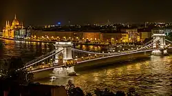 - 🌍 Szechenyi Chain Bridge (Széchenyi lánchíd) (V.). Hungarian pronunciation: [ˈseːt͡ʃeːɲi ˈlaːntshiːd]). This is a suspension bridge that spans the River Danube between Buda and Pest, the western and eastern sides of Budapest, the capital of Hungary. Designed by the English engineer William Tierney Clark, it was the first permanent bridge across the Danube in Budapest, and was opened in 1849. (It is a larger scale version of William Tierney Clark's earlier Marlow Bridge, across the River Thames in Marlow, England.) It is also the oldest permanent bridge on the Danube. It is anchored on the Pest side of the river to Széchenyi (formerly Roosevelt) Square, adjacent to the Gresham Palace and the Hungarian Academy of Sciences, and on the Buda side to Adam Clark Square, near the Zero Kilometer Stone and the lower end of the Castle Hill Funicular, leading to Buda Castle. The bridge has the name of István Széchenyi, a major supporter of its construction, attached to it, but is most commonly known as the Chain Bridge. At the time of its construction, it was regarded as one of the modern world's engineering wonders. It has asserted an enormous significance in the country's economic, social and cultural life, much as the Brooklyn Bridge has in New York and United States of America. Its decorations made of cast iron, and its construction, radiating calm dignity and balance, have elevated the Chain Bridge to a high stature in Europe. It became a symbol of advancement, national awakening, and the linkage between East and West. - The bridge was opened in 1849, and thus became the first permanent bridge in the Hungarian capital, after the Hungarian Revolution of 1848. At the time, its center span of 202 m was one of the largest in the world. The lions at each of the abutments were carved in stone in 1852, by the sculptor, János Marschalkó. They are visibly similar in design to the famous bronze lions of Trafalgar Square by Edwin Henry Landseer with Marochetti, installed 1867. They are also smaller (and appear from below to lack tongues). The bridge was given its current name in 1898.