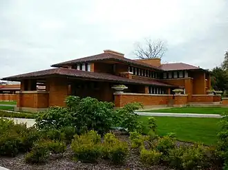 The Darwin Martin House is not the only Frank Lloyd Wright-designed house in North Buffalo. Another one, the π Walter V. Davidson House, can also be found in Parkside. Located at 57 Tillinghast Place in the northwest extremity of the neighborhood, the Davidson House was designed for its namesake, who was an executive at the Larkin Company between 1906 and 1913, thereafter founding the Davidson Shoe Company. Though it's noticeably smaller and more unassuming than the Darwin Martin House β the smaller budget Wright worked with in constructing the Davidson House was perhaps a forerunner of the "Usonian" houses he designed for middle-class clients toward the end of his career β its modest scale belies a stunning two-story living room dominated by a massive bay window at its east end. Sadly, the Walter Davidson House is privately owned and not open for tours.