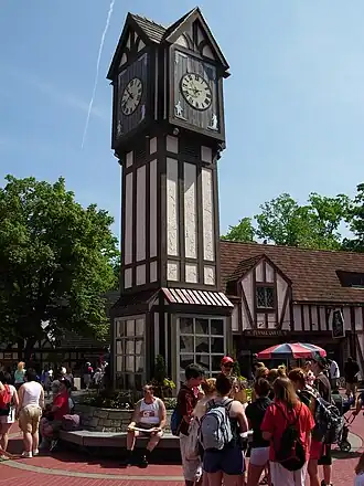 Fashioned after England, complete with stereotypical red telephone booths and common English architecture. A variety of shops await guests in this small hamlet. Guest Services windows are next to the turnstiles of the Main gate. A simulacrum of the famous St. Stephen's Clock Tower (Big Ben) is the central element of this area. Banbury Cross also includes The Squire's Galley, serving breakfast and lunch, as well as a funnel cake shop, ice cream shop, and candy store. Banbury Cross also contains the skyride station nearest to the Main Gate. The Aeronaut (first leg) of the skyride departs to Aquitaine, France, while the Zeppelin (third leg) skyride arrives from Rhinefeld, Germany.
