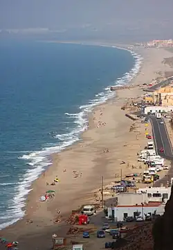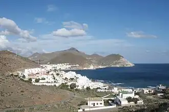 - Cabo de Gata: the strip of beach known as Playa de San Miguel and the adjacent road stretches from the small village of Cabo de Gata to La Fabriquilla before ascending a tiny mountain pass toward the Arrecife de las Sirenas and the stunning beaches beyond. This coastal strip is generally known as Cabo de Gata although it comprises several little smaller villages (pueblitos) including Cabo de Gata, Almadraba de Monteleva, and La Fabriquila. There are hotels and places to eat and drink along this beach.