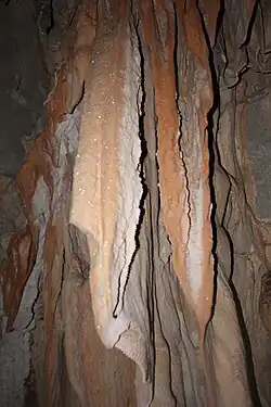 Seven caves make up the caverns. The caves are connected by underground rivers (part of the Rio Candelaria). The main gallery is 22 km in length and the total length of the cave system is about 80 km. Along its path, the river continuously carves out new routes and expands existing chambers. Some of the chambers have ceilings as high as 60 meters. Features such as stagmites, stalactites and flow drapes (cave bacon) are found throughout the caves.