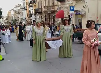 - 🌍 Nostra Principalissima Patrona (The historical recalling of Madonna del Soccorso, Our Lady of the Aid), ☏ +39 0924 30217. On 13 and 14 July (every two years). The event being recalled happened on July 13, 1718, when Castellammare was in the middle of the war between Philip V of Spain and Amedeo of Savoia for the possession of Sicily. A Spanish ship, chased by 5 English ones, sheltered below the castle, which defended it. The English fleet attacked by setting fire to the town: the people, imploring the Patroness (the Virgin Mary), escaped. But suddenly the Madonna, in a white dress, is said to have appeared with a host of angels from Monte delle Scale. This apparition reportedly caused the English to flee in fear. The show represents these events with lights, sounds, pyrotechnic effects and starts at sunset. The recalling ends with a concert and fireworks.
