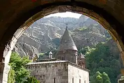 Arguably the most awe-inspiring site in Armenia is the 13th-century π Monastery of Geghard., much of which is carved out of the solid stone of the mountain it abuts. Once housing (and still named after) the lance that pierced Jesus' side, it is sited at the end of a canyon, surrounded by steep rock mountains, with fortified walls, holy springs, an upper chamber with unparalleled acoustics and many intricate khachkars. Monastery of Geghard together with the Upper Azat Valley is a UNESCO World Heritage site.