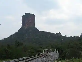 - Marian sanctuary (Santuario Mariano de la Torre Virgen de la Asunta) (A couple of kilometres northwest of the town. There leads a very good quality stone-paved road (which has a full-length sidewalk) - an unusual sight for Bolivia. Ask locals, how to find the road). Designed by Hans Roth (the architect who restored the churches of the Jesuit Missions of the Chiquitos), built from red bricks (adobe), split stones and wooden columns. The setting (at the feet of "Devil's Thumb"), the modern design and the color of the sanctuary makes an unforgettable impression, enhanced further by a multitude of wood-carved fine-detailed columns, doors and decorations, making the Sanctuary an amazing artwork. Inside, the roof is supported by Arbol de la Vida (the Tree of Life) - the giant tree-like wood-carved column. The columns and other woodwork tell the story of suffering - there was a volcano eruption there killing a lot of people; some people escaped by Red Oriental train after the train crossed the fragile bridge and the following lava burned the bridge to the ground, but did not advance further. The sanctuary was built to remember the tragedy and to worship Virgin Mary as a people's savior. The hike to the Sanctuary is an experience in itself - meanders in serpentines and offers good views to Serranía Santiago mountains, "Devil's Thumb", Red Oriental railway.