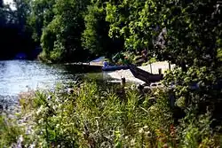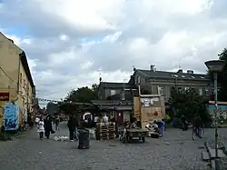 The most famous tourist draw to Christiania is no longer there, but rather on the National Museum in downtown. The old colourful hash-stalls which used to line Pusher street, was demolished in 2004, in an attempt to gain permanent rights to occupy the area from the right wing government. One of them, the signature blue "Ryg med hjem (Smoke-away)" booth, was salvaged, and is now on display in the modern collection of the National Museum, complete with furnace, sales tables and instruments to sell marijuana, but without the authentic goods. ![]() |