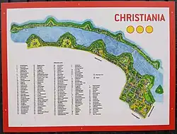 Christiania is an intentional community and commune of about 850 to 1,000 residents, covering 7.7 hectares (19 acres) in the borough of Christianshavn in Copenhagen on the island of Amager.