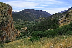 The canyon gouged out by the Quiebrajano River to the south of the city of Jaén makes its way through a land with mountains and sheer rock faces until it reaches the reservoir of the same name. It forms a natural pass between the Jaén and Pago de las Cimbras Mountains to the west and the Propios Mountains, to the east. The canyon plunges to depths of 200 m and its sheer sides are covered in caves and caverns. The uneven escarpments form vertical, narrow landscapes in which the grey and green of the pines dominate; the maritime pines stand out on the rocky slopes although holm oaks and Mediterranean shrub are studded around the exposed sides and high plateaux.