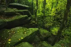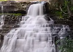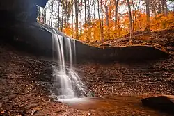 The park encompasses 51 mi² (134 km² and 33,000 acres) along the banks of the Cuyahoga River, spanning from the major metropolitan areas of Cleveland and Akron and into the hills of the Allegheny Mountain range. The diverse landscape, including sandstone ledges, 70 waterfalls (most notably Brandywine Falls), rolling hills and river gorges, can be viewed from 186 mi (299 km) of trails.