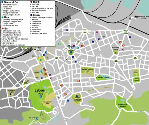 Zhongshan District (中山区; Zhōngshānqū), at the eastern edge of Dalian, encompasses the main business and commercial centre of Dalian and many of the most scenic parts of the southern coastline. As a result visitors to the city tend to spend most of their time here, a fact reflected in the wide range of hotels and restaurants found in the district. The downside of this popularity is that hotels, restaurants and shops tend to be more expensive than in other parts of the city. That being said for those who can afford it, or take advantage of the few lower budget options available, Zhongshan District makes for an excellent base for exploring Dalian.