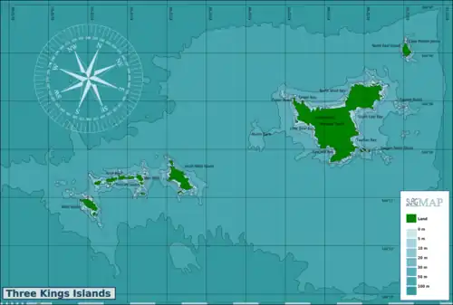 The Three Kings Islands is a small archipelago of 13 islands about 55 km (34 mi) to the northwest of Cape Reinga, the northwesternmost point of North Island, New Zealand. The archipelago consists of two groups: To the west, the small islands, West Island, Princes Islands and Southwest Island, and to the east, Great Island and Northeast Island. They are on the Three Kings Bank which is separated from the New Zealand mainland by an 8-km-wide, 200- to 300-m-deep trough.