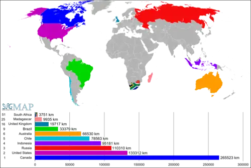 The coastline from the Orange River Mouth bordering Namibia in the north west to Ponto do Ouro bordering Mozambique in the north east is approximately 3750 km long, ranking 51st longest of 195 countries.