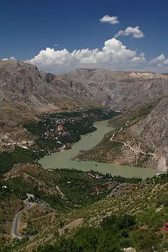 Upriver along the Euphrates, you will arrive in Kemaliye, locally Eğin, which sits in a particularly lush valley bottom. It is a beautiful town with many mansions, sharing a similar architectural style with those of Harput. In the outskirts, a series of tight tunnels and passes negotiate a formidable and barren terrain high above a deep gorge. If anywhere could be called "the beaten path" in this part of the world, that would be the trio of Harput, Kemaliye, and nearby Divriği (in Central Anatolia).