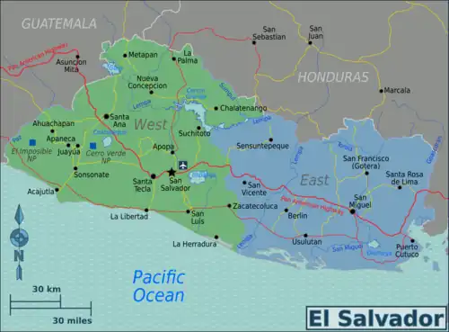 Although El Salvador only covers an area of about 21,040 km2 (the smallest country in Central America), it is the most densely populated. El Salvador is home to more than 6,500,000 people. It is divided into 14 sections called departamentos. It has 25 volcanoes, 14 lakes, and four large cities and is divided in to East, Central and West with the capital San Salvador in the central region, Santa Ana in the west, and San Miguel, the largest city in the east.