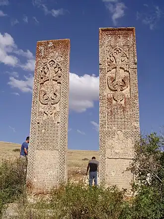 - 🌍 Üçpınar (meaning "three springs") was once the Armenian village of Abrank (Ապրանք), but in 1915 that community was variously massacred, deported or fled. Two km south is the ruined 13th century Surp Tavit (Saint David) Monastery. By it are two 6-m tall khachkars, elaborately carved Armenian memorial stones: probably the finest still standing in Turkey, and maybe the tallest in the world. The approach road is in bad shape, so hike from the village rather than breaking an axle.