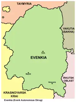 Evenkia (Russian: Эвенки́я eh-vehn-KEE-yuh) is a vast Siberian region in Krasnoyarsk Krai, the size of Turkey, but with a very sparse population — a mere 0.023 people per km2, less than 20,000 people in total. Evenkia borders Taymyria to the north, Yakutia to the east, Irkutsk Oblast to the southeast, and the Krasnoyarsk region to the southwest and west.