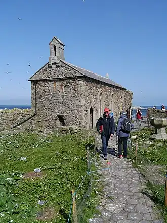 - St Cuthbert's Chapel is near the landing point on Inner Farne. An early Culdee hermit tradition brought St Aidan to Inner Farne in 651 AD, followed by St Cuthbert (634-687). Here Cuthbert lived in solitude until becoming Bishop of Lindisfarne, and returned to spend his last years here. There are remains of his hermit cell, and adjacent is the chapel built in the 14th century and modified in the 19th. Benedictine monks affiliated to Durham had an outpost here until the Dissolution.