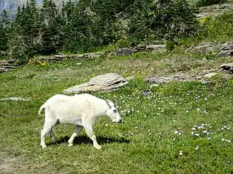 Glacier National Park is the rare area of the United States where all of its pre-Columbian predators are still alive and well. The most dangerous of these are bears - both grizzly bears and the smaller black bears. The park is a great habitat for bears, and signs at every major trailhead warn that you are "entering grizzly country". Most hikers in the park prefer to buy bear spray (~$50, available at camping stores in West Glacier and St. Mary), which has a range of 30–40 feet and is known to deter a bear in the rare case that it becomes aggressive. The best precaution against bears, however, is to make noise while you are hiking to avoid surprising one and to allow it to identify you as human. When entering thickets or rounding corners, simply start talking to let any animals know you are coming. Some people carry whistles or bells to make noise on the trail, but others consider this measure useless or even counter-productive. Should you encounter a grizzly bear, avoid eye contact, turn sideways to appear smaller and less threatening, and slowly back away. It is rare that a bear would become aggressive, but if a grizzly bear charges, clacks its teeth, makes woofing or huffing noises, or waves its head from side to side, drop to the ground on your stomach or in the fetal position, protecting your face and neck (big backpacks are helpful for this). Most grizzly charges are "mock" charges, and while terrifying the bear normally turns away. During black bear encounters, gather your group together to appear as large as possible, and make noise to help the bear identify you. In the very rare case that the bear becomes aggressive, fight back. When you get your permit, you will be given up-to-date information about recent bear activity on your planned route. Pets are prohibited on trails because they may provoke bears.
