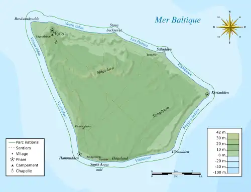 There are two areas in this national park where sleeping is allowed: the 🌍 Lägerplatsen (Camp area) and the 🌍 Fyrbyn (Lighthouse village). Both are by the northern tip of the island. All lodging must be booked in advance via Sandöresor, and maximum stay is one week. Wherever you sleep you have to clean up the area yourself and check out before 12:00 on the day of your departure.