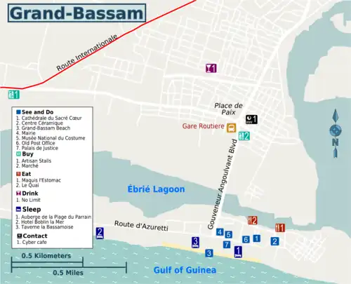 - 🌍 Hotel Boblin la Mer, Route d'Azuretti, ☏ +225 21 301418. Small hotel with the beach on its doorstep. CFA 12,000 per night.