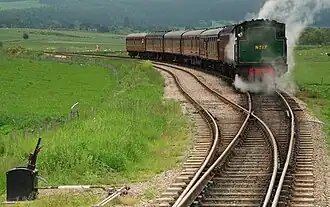 - π Broomhill station is the north terminus of the Strathspey Railway, a heritage line. The original line ran through the valley from Aviemore to Forres until the Beeching cuts of 1965, when the station was demolished. It was rebuilt in 2002 in period style, serving as "Glenbogle" in the TV drama Monarch of the Glen to 2005. Most visitors start their ride at Aviemore, and the train makes an extended stop at Boat of Garten for the main collection of locomotives and rolling stock, but you can start your trip at Broomhill. Further restoration of the line towards Grantown is blocked by the A95. As if in denial, the train chuffs on for a short distance beyond Broomhill then comes to a dead-end in the fields; the locomotive changes ends via the passing loop and the train returns south.