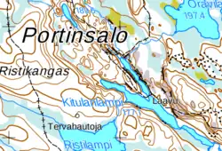 The Allaslahti lean-to shelter near the Autiojärvi lake is 7 km from Hiidenportti, the trailhead a further 3 km to south-west, on the Talonpojan Taival trail. There is an orthodox graveyard on a small island in the south end of Autiojärvi, between Allaslahti and the trailhead. Along roads the trailhead is 10 km from Käärmesärkkä. You could arrange to be dropped off here and hike via Palolampi to Käärmesärkkä or Urpovaara. The other way would be natural if you are on your way to the UKK trail (between Koli National Park to Urho Kekkonen National Park, with some non-established legs), but the Talonpojan Taival has been neglected to the point of being unwalkable at some stretches. Check whether the situation has improved. You could hike the first 10 km to 🌍 Murtovaara Talomuseo. and Tammitupa (check whether there are services by request) along the trail and continue by roads.
