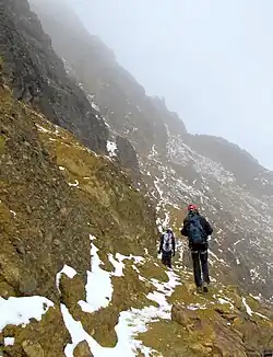 Parts of the ascent route is exposed and you will need a rope at least for the chute; less experienced climbers need a rope for other parts of the climb too. Loose rocks are also a risk along the route.