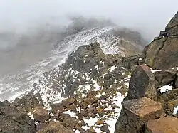 From the saddle the route first follows the rocky southeastern wall with some scrambling until the pre-summit Pico Villavicencio. From there, you will cross into the steep but not so difficult northeastern wall, also known as Paso de la Muerte (Death Pass) almost to the northeastern ridge; the last part is a short and steep chute with loose rocks (bring a helmet). Once on the ridge, there's some scrambling to reach the summit. There are nice views from the summit, weather permitting, and unlike most other mountains in Ecuador there's also a summit cross.