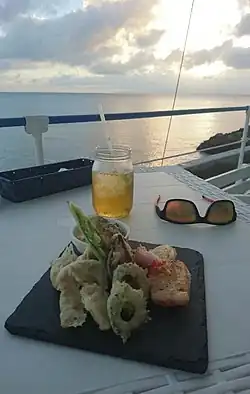 St. Elmo Food🌍St. Elmo's Café & Kitchen,新川1629-3,☏ +81 980-87-6250.Daily 11:30-16:00, 18:00-21:00.This is a nice place to see the sunset. The sun will set into the ocean right before you and you couldn't ask for a better place to be. The food presentation is nice and the service is very friendly. If you are looking for a relaxed, calm and easy going place to have a drink and see the sunset, this is a good choice within a reasonable distance of Ishigaki town (if you have transportation).(updated Nov 2016)