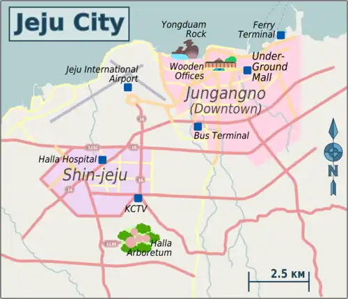 Finally, on the coast both north of Shin-Jeju and west of Jungangno lies Jeju International Airport.