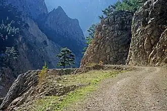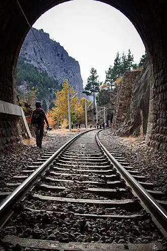 - 🌍 German Road (Alman Yolu or Taşdurmaz - "[even] the stone doesn't balance") twists and turns southeast to Kıralan / Hacıkırı, just north of the Varda Bridge. Before this preliminary trail was laid, they couldn't even survey the railway route let alone hack it out. It's now a hiking trail (with no water supply) littered at intervals with rusty abandoned equipment. Mountain bikers and motorcyclists are known to do the trail, but much of it is loose scree, with barely a single tyre-width where landslips have eroded it, and a breakneck drop to the river below.