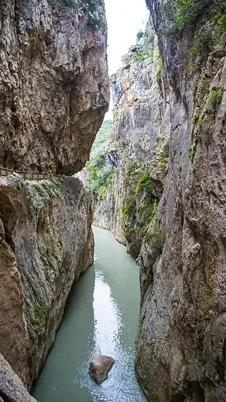 - 🌍 Kapıkaya Canyon is usually entered from its southern downstream end, above Kapıkaya village 6 km southwest of Karaisalı. This gorge of the Çakıt River was occasionally used as an alternative route to Gülek Pass, and a 7 km trail has been etched into the canyon walls. The river in spate is a white-water torrent. In places the trail is close to the river, made tricky by landslips, and since 2022 you have to ford the river then cross back. Midway there's a waterfall and a rope bridge crossing.