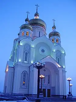 - 🌍 Cathedral of the Transfiguration (Spaso-Preobrazhensky Cathedral, Преображенский Кафедральный собор), Lenina St. Christianity is alive and well in Russia, as this golden domed church towering above Khabarovsk is evidence of. Only completed in 2004, at 83 meters it's the 3rd tallest church in all of Russia - inside it's not that impressive, just large. The monastery, or rather the Theological Seminary, right next to it is also worth a look a brief look from the outside. Opposite, facing the Amur is a war memorial "Вечный огонь" ("the eternal flame"), rather kitschy but has good Amur views. The whole thing is labeled as the Ploshchad Slavy or the Square of Glory.