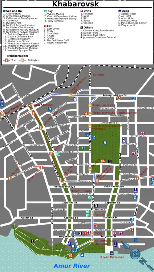 Overlooking the confluence of the Amur and Ussuri Rivers, Khabarovsk is the second largest city in the Russian Far East, approaching 600,000 residents and growing. It is also the capital of both Khabarovsk Krai and the Far Eastern Federal District. Unlike Vladivostok, the city has never been closed to foreigners, and retains a distinct international feel, rare for the Russian provincial centers – a feeling propped up by an increasing Asian presence with arrivals from Asian countries now numbering over a million each year. In turn, Asians come here to experience a piece of Europe close to home, with the fortunate effect that the city is spending huge swaths of money renovating the city, in which old classical buildings were spared much of the destructive effects of the 1917-23 civil war, to provide its visitors with just that feeling. From a European's perspective, Soviet city planning has unmistakably taken its toll, but it is still far more attractive than your average Siberian city.