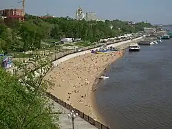 - 🌍 City Beach (Хабаровский пляж). Pictured on the right, the beach on the River Promenade just below the cathedral is hugely popular with pedestrians on warm summer days and packed with sunbathers — so much so that it's easy to forget you are over 300 km away from the nearest piece of coast. It is possible to take a quick dip, but stay very close to land as the current is strong, and keep in mind there are old world Chinese and Russian industries upstream. Usually there are some inflatable slides set up for kids.