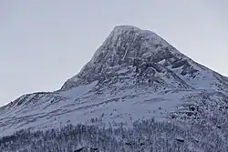 Bárrás fell in Norway seen from north-west. - From the tripoint hiking trails lead to the Swedish and Norwegian fells. 🌍 Goldahytta hut is 3 km from the tripoint, 🌍 Gappohytta hut below the 🌍 Paras fell (Sámi: Bárrás) a further 14 km away (both locked with the DNT key). From here the trail leads to the 🌍 Pältsa hut at 🌍 Pältsa in Sweden (12 km; the hut was used by the Norwegian resistance during WW2) and back to Koltalahti (14 km). Instead continuing by Nordkalottleden one can extend the hike as much as one likes.