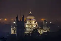 • 🌍 Victoria Memorial (ভিক্টোরিয়া মেমোরিয়াল Bhikṭoriẏa Memoriẏal), Queen's Way (metro: Maidan  1 , Rabindra Sadan  1 ), +91 33 2223-5142, . Tu-Su 5:30 AM-6:45 PM, Son et Lumière (English) 7:15 PM Oct-Feb and 7:45 PM Mar-Jun. Kolkata's most celebrated landmark, this monument was built with imperial self-confidence and was the brainchild of Lord Curzon, one of India's most flamboyant Viceroys. The domed structure was completed in 1921 with marble used from Makrana. Now a museum, the Victoria Memorial's 25 galleries are spread over 2 floors. The collection covers a fascinating selection of Raj memorabilia and includes the Calcutta Gallery with oil paintings and watercolours of the city's history. Do not miss the grand Durbar Hall, inside which lies a statue of Lord Cornwallis.   The museum is set in extensive and beautiful lawns, and is lit up at night. A laser audio-visual show is held on the lawns every evening. "Nike", the Greek Goddess of victory, on the top of the museum is said to be haunted, and has been prominently featured in many Kolkata stories and novels. For garden; ₹4 for Indian; for museum ₹10 for Indian and ₹150 for foreigner. Camera free. Fee for light and sound shows are ₹10 and ₹20.