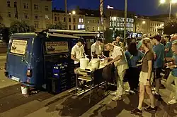 - 🌍 Kiełbaski z Niebieskiej Nyski, Grzegórzecka 4 (in front of Hala Targowa). Daily 20:00-03:00. The "Blue Nysa" is a Krakow institution that has been serving up sausages cooked on a wood-fired grill since 1991, shortly after free enterprise was allowed again. The menu is as simple as it gets: 15zł for a kielbasa with a squirt of mustard (ketchup is optional), 3zł for a stale bread roll, 3zł for gazowana (a Communist-era orange-flavored soda). There's one shared table to stand around and make new friends. There's always a queue, and it can get rowdy late at night.
