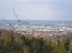 Lübbecke from the Wiehen Hills. In the foreground is the Old Town and St. Andrew's Church; in the background, the industrial estate and North German Plain