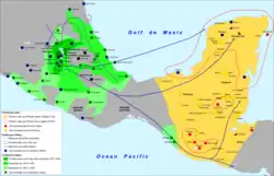 The Mesoamerican civilizations differed sharply from their northern and southern neighbors. At the time of the Spanish conquest, there were two major civilizations in Mesoamerica: the Aztec in what is today Central Mexico, and the Maya in what is today the Yucatan and northern Central America. (There were also dozens of less influential civilizations.) In the map shown here, green is the Aztec realm of influence and yellow is the Maya realm of influence. Gray areas were dominated by other, less influential or more isolated civilizations, including the Purepecha, Zapotec, Tlaxcala and other peoples.