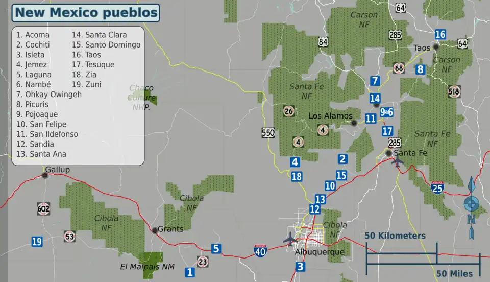 There are a variety of ways to get in to New Mexico - see the Get in section on the New Mexico article for further details - but once you get in, you'll need a car to travel to and between the pueblos. Specific directions are given for each pueblo below. Roads are generally in good condition, but some are narrow and you may wind up on a couple of gravel roads for the more remote pueblos. Pueblos along a main road (such as those along I-25 between Albuquerque and Santa Fe) will usually have a gas station along said main road, but those pueblos off the beaten path will often have virtually nothing in terms of gas stations —head to the nearest town or large road to find one.