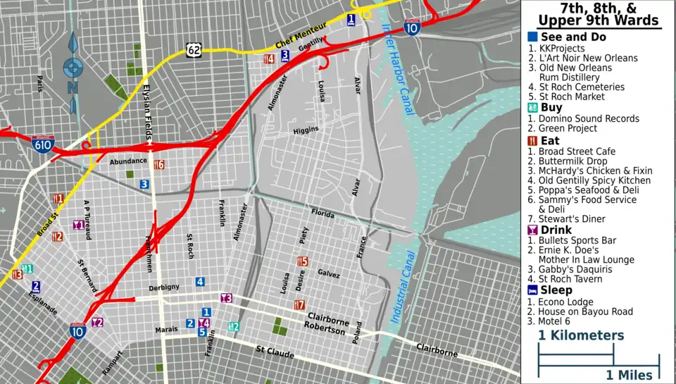 - No Dice, 2239 St. Claude (At the corner of Marigny Street, a block down from Elysian Fields and across St. Claude from Old Marigny), ☏ +1 504 945-4446. Local bar with more of a Marigny than 7th Ward vibe; also has live music and other events some evenings.