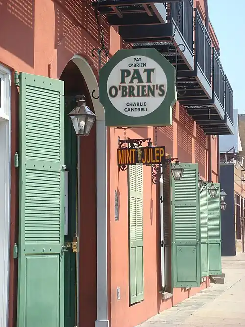 - π Pat O'Brien's, 718 St Peter St (between Bourbon and Royal Sts), β +1 504 525-4823, toll-free: +1-800-597-4823. Famous for strong Hurricanes, Mint Juleps, TNTs, Purple People Eaters; popular tourist hangout for a reason. Has been trendy for generations. Has an impressive fire/water fountain and patio.