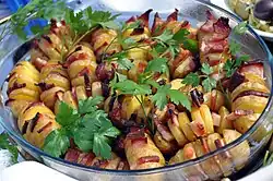 Typical Macedonian food resembles the food of the southern Balkans, meaning loads of grilled meat (known as skara). Side dishes usually have to be ordered separately. North Macedonia is also famous for its shopska salata, a mixed salad of cucumbers, tomatoes and grated sirenje. Sirenje is a white cheese similar to feta cheese. Usually Macedonians will translate the English cheese to sirenje. Another local speciality is ajvar, a red paste made from roasted peppers and tomatoes, which is either used as an appetizer or side dish. Another typical local dish is tarator which is comparable to the Greek tzatziki. It is made of yoghurt, cucumbers, and garlic and it is served as a cold soup.